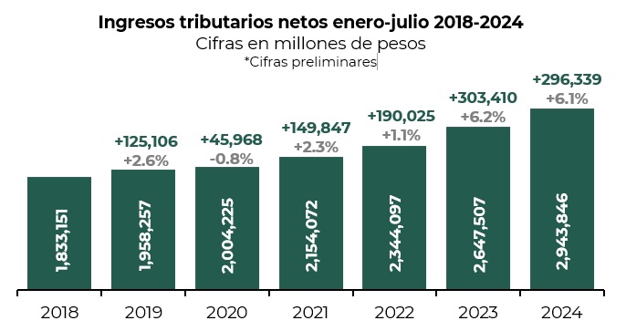 メキシコ財務省(SAT)は、2024年7月までの税収が2.9兆ペソに達し、前年同期比で6.1%の増加を記録したと発表した。この増加は、所得税(ISR)および付加価値税(IVA)からの収入の増加が主な要因である。所得税は前年比で7.8%増加し、付加価値税は5.3%の増加を示した。また、政府は税収の成長が国の財政安定に寄与していると述べ、特に自営業者や企業の納税意識の向上が重要な役割を果たしていると強調した。