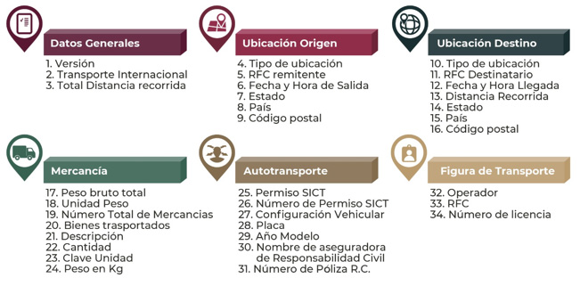 Carta Porte補完要素は、Autotransporteに必要な情報を提供するために、6つのセクションに分かれた34の必須フィールドの記入を必要とする。一部の情報源が示唆しているように、最大142のフィールドまでではない。